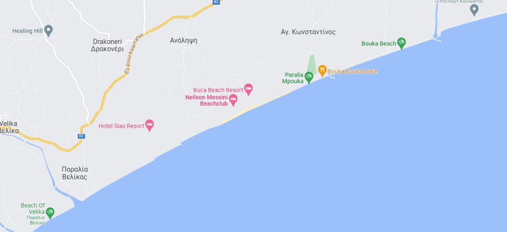 Analipsi is a small village in the Peloponnese region of mainland Greece. Not to be confused with the place of the same name in Crete. The closest city and airport is Kalamata to the east. The main reason you would go there is the long beach near the village. It goes from Bouka Beach along to Velika Beach and maybe further.