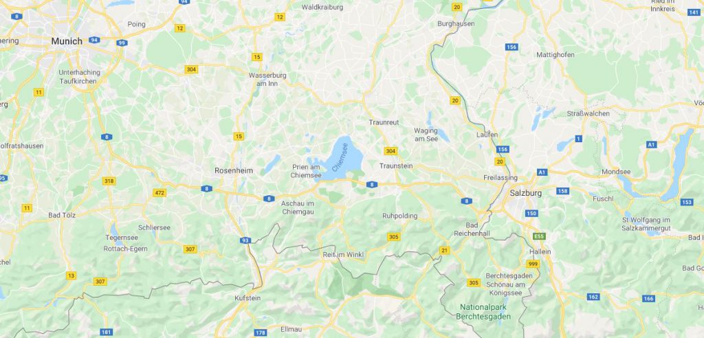 The two cities are around 2 hours apart by regular train or slightly less by car or high speed train. Salzburg is very close to the border of Germany and Austria so most of the journey is in southern Germany in the Upper Bavaria region. The train skirts the lakes of Chiemsee and Simssee and there are views of the alps to the south. Bavaria itself is quite picturesque though part of the journey will be through urban parts of Munich and Salzburg.